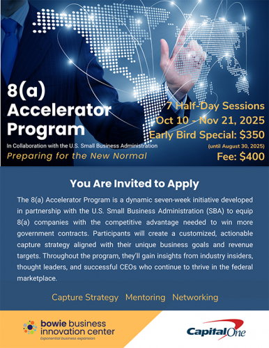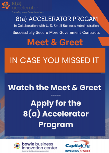 - Access to the Bowie Business Innovation Center (Bowie BIC) business Accelerator program resources for government contractors.